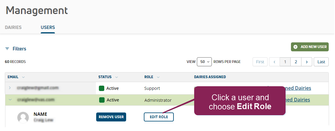 The Dairy Support Management Tool supports two unique roles: Administrator and Support. The main distinction between the roles is that an administrator can add new users and remove them: