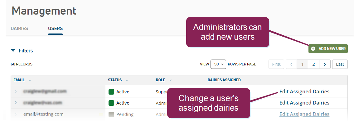 The Users page allows you to add and remove users, as well as adjust a user's assigned dairies.